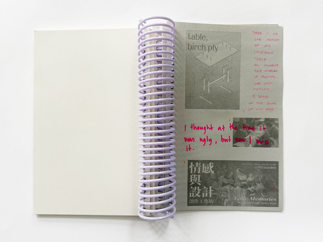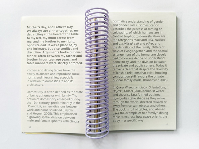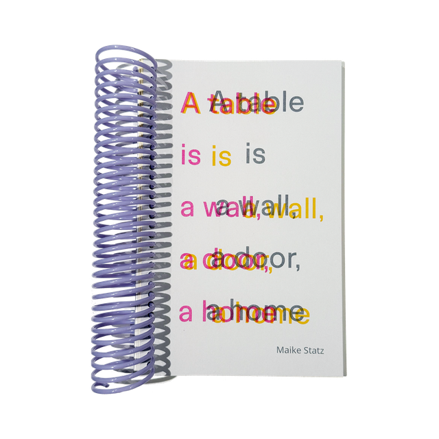 A table is a wall, a door, a home by Maike Statz is part-workbook, part-essay, and part-personal narrative. It's a heady and satisfying mix, complete with oversize sculptural lilac spiral binding. A table is wall, a door, a home both builds upon and documents a series of workshops conceived and carried out by Statz in Bergen and Taipei. It is also part of a solo exhibition by Statz in Riga, Latvia in the summer of 2025.
