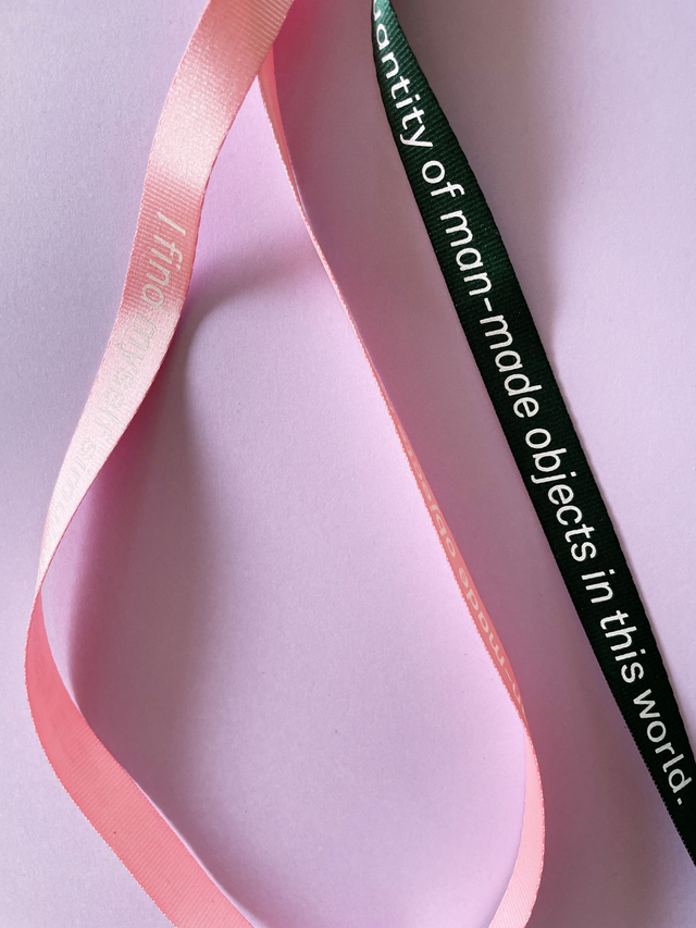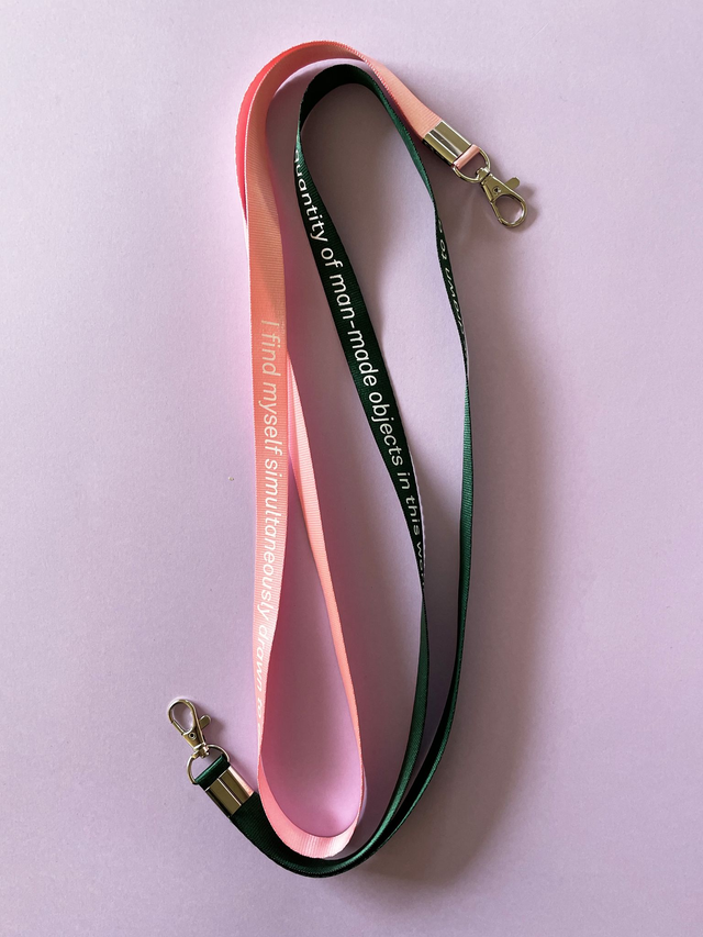 Limited edition (100) silkscreened lanyard by Jessica Williams. White ink on forest green or pink band.