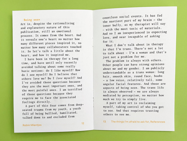 πππ π©πππ£ππ¨ π'π’ πππ§πππ π©π€ ππ¨π ππ€π§ by Robin Mientjes is the companion piece to an artwork especially produced to be part of the yearlong experimental exhibition (ππ)πππππππ at House of Foundation. The artwork, a photographic installation, is equal parts therapeutic exercise and creative challenge; a reckoning with deep-seated traumas in the form of an artwork that directly requires submission to those fears.