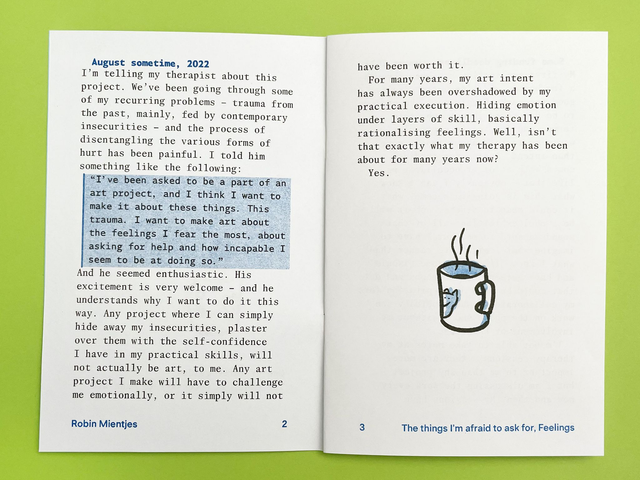 The artist publication, a "manual" consisting of three small booklets, tackle the rational and understood parts of creating art, while the artwork itself contains only the emotional and felt parts. Together they reveal a multifaceted depiction of trauma, and suggest new ways to learn and feel.